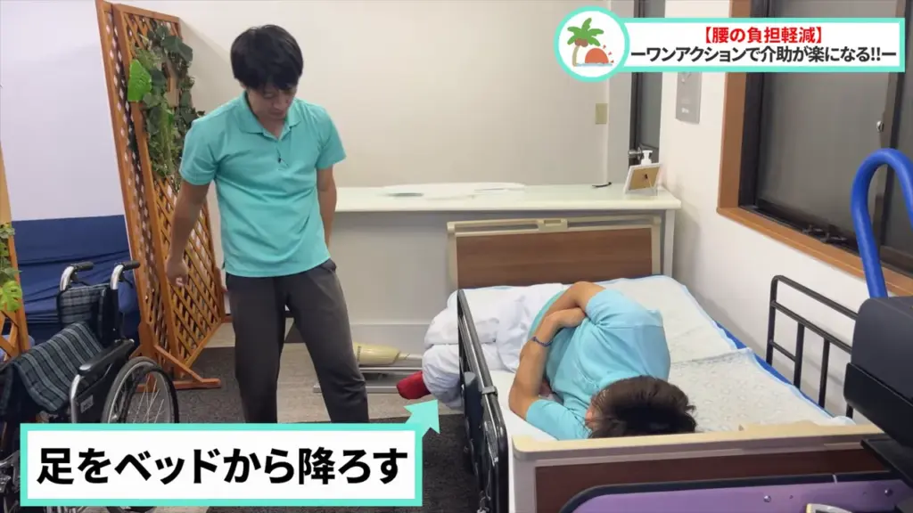 ここからは、実際に「足を下ろすワンアクション」を取り入れた起き上がり介助の手順を解説します。