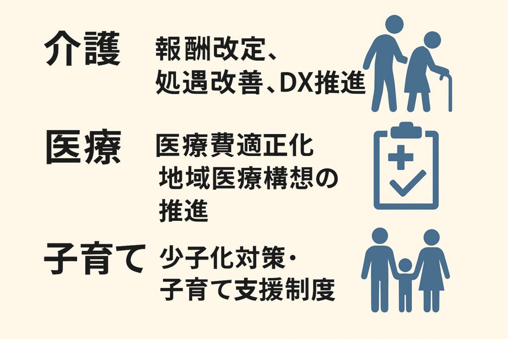 2025年10月、高市早苗さんが新たに政権を発足させ、「介護」「医療」「子育て」を柱に掲げています。